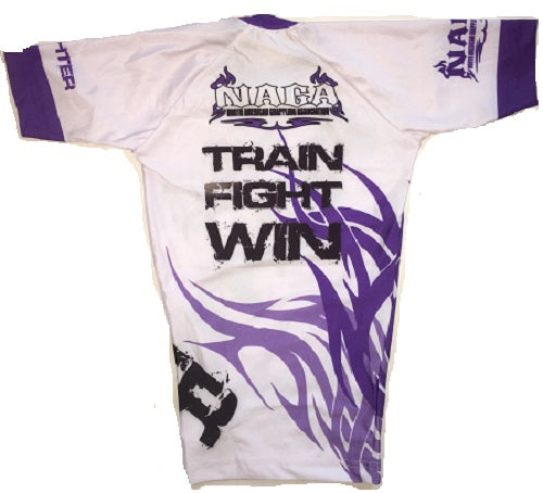 Price includes shipping anywhere in the Continental US.This new rash guard is white with a purple tribal design. The sublimated NAGA Fighter logo looks fantastic on this female rash guard. These short sleeved rash guards are made of a light durable stretch material. They are available in Kids Small, Kids Medium & Kids Large. Also available in Adult Small, Medium and Large.